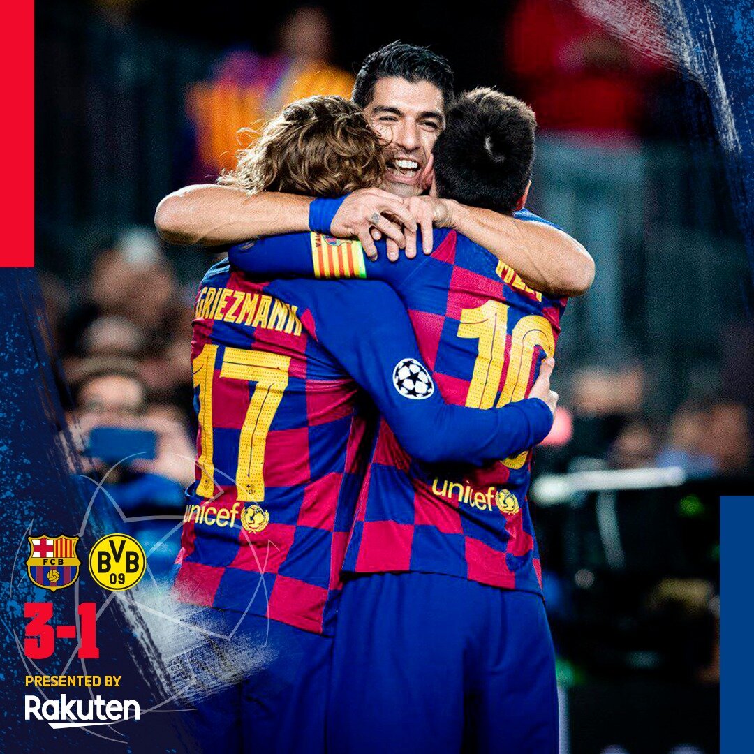 Месси проводил свой 700 матч за Барселону и выдал очередной матч конфетку- гол плюс 2 ассиста у Боруссии просто не было шансов, только в концовке Барса подсела и стала играть на результат. Троица, а именно Месси, Cуарес, Гризманн отметилась по голу, совместный ужин однозначно пошел на пользу, стоит отметить и новый выдающийся рекорд капитана Барселоны, Месси забил тридцать четвертому сопернику в Лиге Чемпионов, обойдя Роналду и Рауля. В этом поединке состоялось и несколько нетривиальных моментов, в одном из эпизодов рефери получил мячом по лицу, а Гризманн попытался убедиться, что судья в порядке, но наибольшую реакцию вызвало падение в штрафной площадке Боруссии на пятьдесят первой минуте Лео получил жёлтую карточку за симуляцию, но по реакции аргентинца было видно, что он и не собирался выпрашивать пенальти, что VAR проверил эпизод и убедился в дайвинге Месси. Месси и симуляция- такое редко увидишь, тем не менее это был очередной потрясающий концерт Лео. Барса 1 в группе смерти,