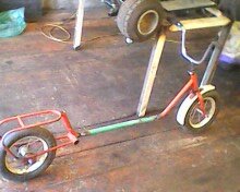 Начинал я очень давно еще один проект. Сначала хотел сделать самокат, но потом решил сделать микро чоппер. Дали мне для этого удовольствия велосипед дружок, а в металлоломе мне подвернулся симпатичный бензобак. Начал я с интересом. Купил двигатель от бензопилы, начал резать раму, сделал руль. Но потом я перестал уделять ему время и забросил. В итоге сдал в металлолом. Вот такие фотографии только остались.