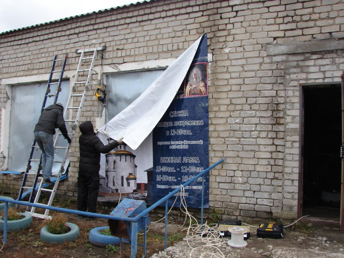 Плодовый. Наш добрый помощник, Никита Вавилов - владелец рекламного агентства "Артефакт", прислал сотрудников, чтобы укрепить на храме баннеры. Перевесили их с вагончика, который прослужил нам храмом почти три года. А сейчас его перевезли на место стройки другого храма. Спаси Господи! https://vk.com/artefact173