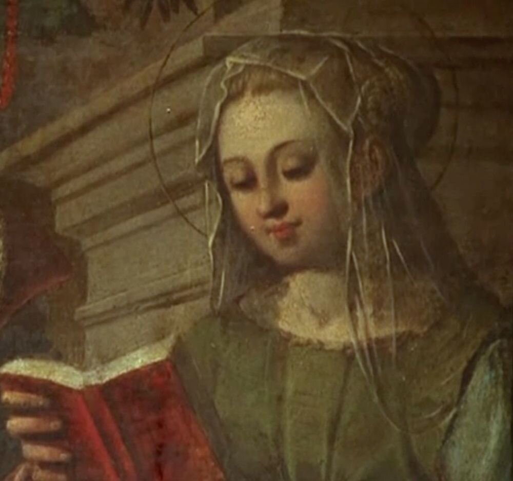И вот что интересно: в семейной усыпальнице рода Карафа в самом центре висит картина Vergine col bambino, на которой изображена в том числе и Мария д'Авалос, и вроде как именно там она и похоронена, под боком у любовника. Но это не точно. А на картине вон она справа с книжечкой, круглолицая такая. Прижизненный портрет, между прочим.