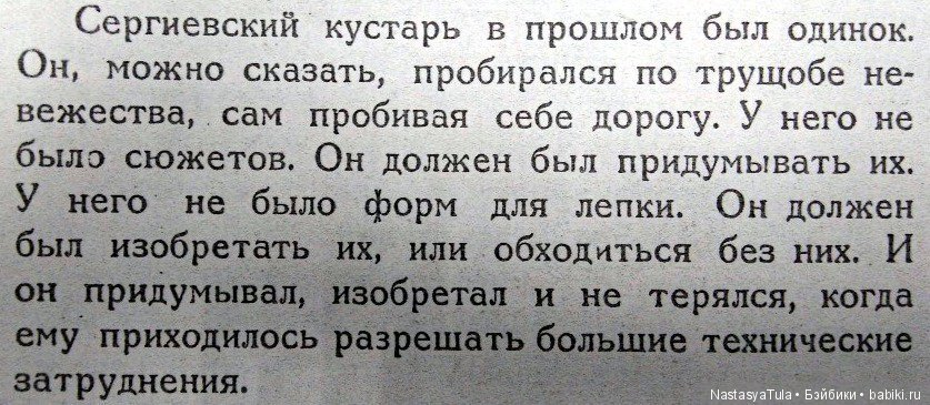 Он дожил до 81 года, не смотря на репрессию и войну. И я очень полюбила этого автора — по-настоящему аристократичного, оперирующего научными фактами и сделавшего уникальную аналитику кукольного промысла в Сергиевом Посаде.