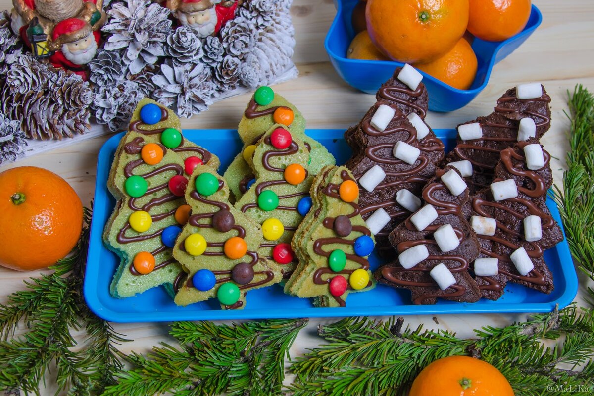 Яйца взбить с сахаром. Добавить масло, цедру и хорошо все вымесить. В отдельной посуде смешать сухие ингредиенты - муку, какао и разрыхлитель и соду (для шоколадных елок).