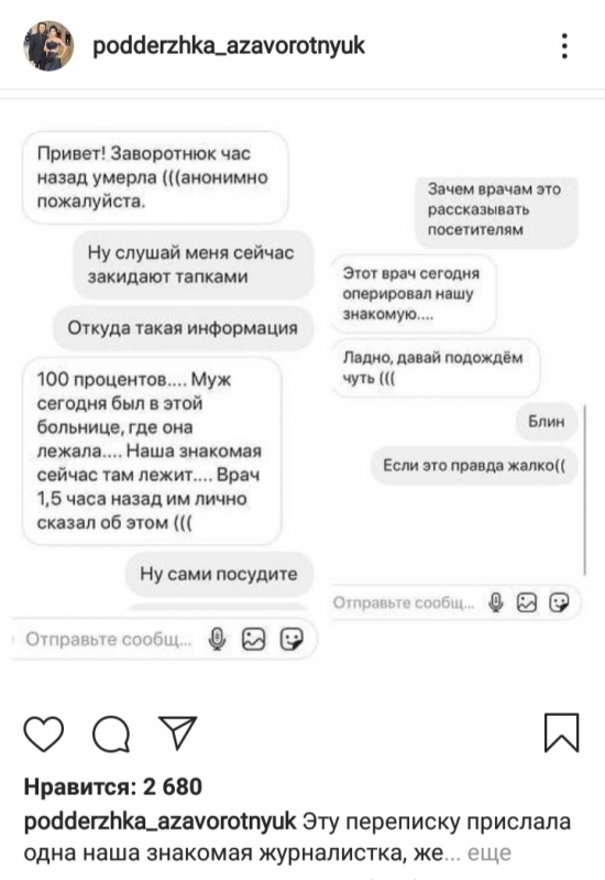 В Сети распространилась информация о том, что Анастасия Заворотнюк умерла. С официальным комментарием выступили близкие актрисы. Информация о смерти Анастасии Заворотнюк распространилась после того, как в Сети появились скриншоты некой переписки. Один собеседник утверждал, что звезда сериала "Моя прекрасная няня" умерла "час назад", ссылаясь на то, что в том же центре лечится его родственник. А второй дал понять, что не может поверить в это. В итоге отреагировали близкие актрисы. На страничке, посвященной поддержке Заворотнюк, в социальной сети "Инстаграм" появился официальный комментарий. "Это все за гранью этики, здравого смысла и человечности. Да, люди так не поступают. Так могут поступать только существа низшего звена", – высказали свою оценку люди из окружения актрисы. Они опровергли эти данные. "И главное – нет, это неправда! Всех неравнодушных снова благодарим за ваши молитвы и добрые слова!" – обратились к общественности близкие Заворотнюк. В завершение своего поста они от