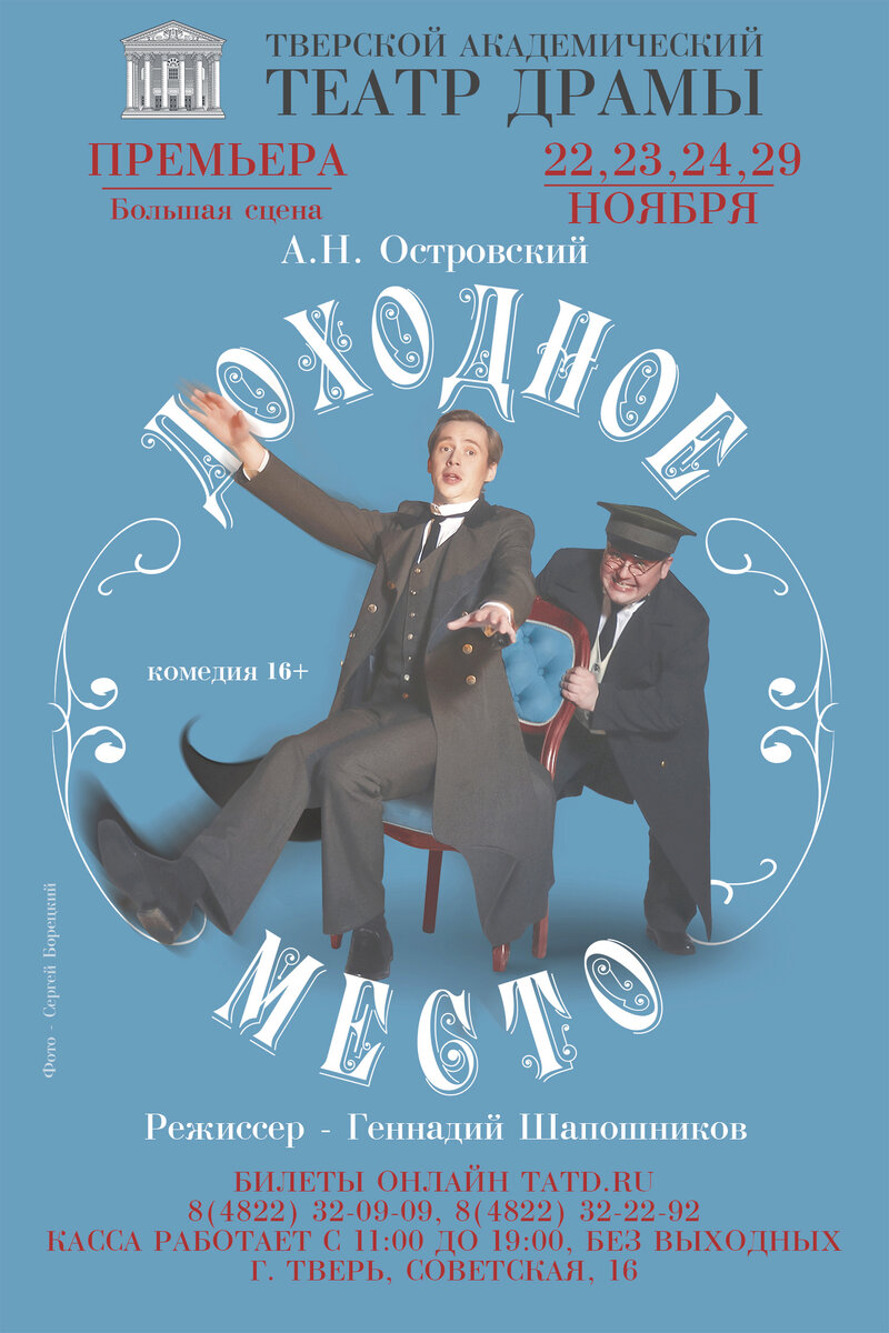 Первые показы комедии «Доходное место» по пьесе русского классика А.Н. Островского пройдут 22, 23, 24 и 29 ноября. Режиссёр-постановщик спектакля «Доходное место» – Геннадий Шапошников, главный режиссёр московского «Театра на Покровке», главный режиссёр Ростовского академического театра драмы имени М. Горького. Мастер придерживается стилистики русского психологического театра. А.Н. Островский в своём произведении в сатирической форме критиковал пороки «чиновничьего мира». Драматург имел незаконченное юридическое образование, сам работал писарем в светском и коммерческом судах: «Не будь я в этом аду, не написать бы мне «Доходного места». Однако, все пьесы Островского, какие бы пороки общества они не высмеивали, всё равно, в первую очередь, о любви. Настоящие чувства преодолевают любые трудности. В премьерные дни все гости Тверского академического театра драмы будут решать для себя вопрос «Давать взятки или быть честным?» В фойе начнёт работать настоящее Министерство по Премьерам! Чино