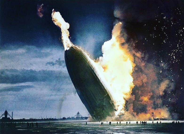 Крушение дирижабля LZ 129 «Гинденбург». Авиабаза Лейкхёрст, городок Манчестер-Тауншип, штат Нью-Джерси, США, 6 мая 1937 года. Этот жёсткий дирижабль, был построен в 1936 году (всего за год до крушения) в нацистской Германии. Был самым большим в мире из созданных до того времени дирижаблей. Своё название воздушный корабль получил в честь рейхспрезидента Германии — Пауля фон Гинденбурга.
