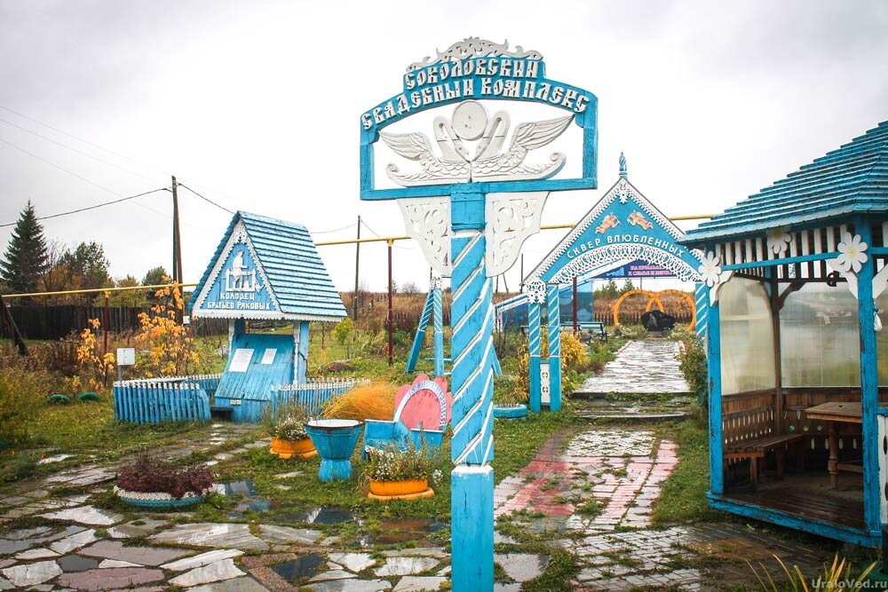 Во время путешествия по Режевскому району Свердловской области нас приятно удивила небольшая деревушка Соколово. Вместо типичной разрухи, в центре деревни встретился необычный свадебный комплекс. И это в деревне с населением, по данным переписи 2010 года, всего-то 51 человек!.. Деревня была основана в 1680-х годах братьями Кириллом и Иваном Ряковыми. В память о своих предках в 2011 году уроженец деревни Василий Николаевич Ряков вместе со своими сыновьями восстановил колодец и назвал его в честь первопоселенцев братьев Ряковых. Затем Ряков и неравнодушные люди продолжили преображать пространство. Рядом с колодцем появились следующие объекты: Здесь есть скамейки и беседка. На земле уложена плитка, летом в клумбах растут цветы. Немного портит вид лишь труба проходящего тут газопровода. В Соколово приезжают молодожёны из Режа и окрестностей, а также останавливаются нечастые в этих местах туристы. Местные жители организуют специальные программы для новобрачных и просто гостей. Вот так благ
