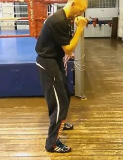 Фронтальная стойка – ноги на ширине плеч, согнуты в коленях, ступни параллельны, спина полукруглая, голова опущена, плечи опущены (в одну линию: плечо, колено, носок ноги), руки согнуты в локтях. Используется фронтальная стойка как учебная, и в бою на ближней дистанции. Отработка вращения. Удерживать положение фронтальной стойки, главное не выпрямлять спину, плечи. Встать на носки, и одновременно падение на одну ногу с вращением пяткой другой ноги на 90 градусов. То есть вращение совершается не плечами, а именно пяткой, и нога жёсткая прямая. Обратное вращение также не плечами, а просто опустить пятку на место. Ударное движение получается: пятка, плечо, кулак одновременно, но пятка вначале. Не торопитесь, делайте медленно.