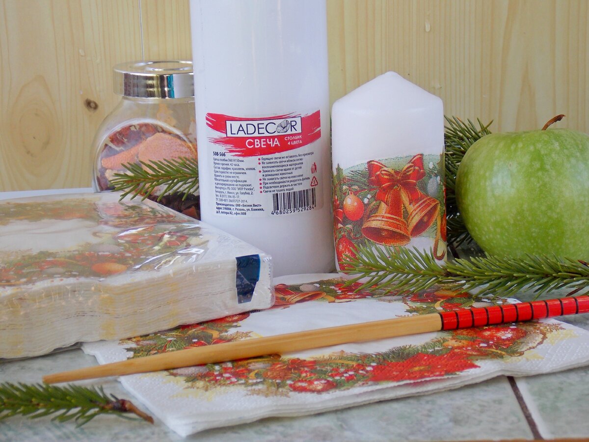Привет! Оказывается, чтобы сделать обычную свечку, нарядной и красивой, не нужно даже клея. Просто берем салфетку с узором, свечу и любую палочку. Отделяем верхний тонкий слой салфетки. Вырезаем нужную картинку. Прикладываем картинку к свечке и трем поверхность палочкой, разглаживая картинку. От трения свеча немного нагревается и плавится, поэтому бумага хорошо приклеивается к поверхности свечки. Получается быстро, просто и красиво! Можно добавить, если есть желание, декора: бусин, блесток и др. Для вдохновения и новогоднего настроения, нашла еще такие свечки. Последний вариант мне очень понравился. Залить разные специи или ракушки парафином и необычная свечка готова.