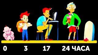 В современном мире средняя продолжительность жизни среди мужчин составляет 70 лет и 75 лет среди женщин. Может показаться, что этого вполне достаточно, чтобы успеть реализовать себя в университете, на работе и так далее. Но, может, в жизни все же есть дела поважнее? Что если люди жили бы всего 24 часа? Если предположить, что 70 лет превратились в 24 часа, выходит, уже через 12 минут после рождения вы начинаете ползать. Через 18 минут после рождения вы начинаете учиться ходить. Через 5 минут после того, как вы перестали ползать на четвереньках и начали передвигаться на двух ногах, у вас появляются первые членораздельные звуки. Именно, прошло всего 23 минуты, как вы увидели этот свет, и вот вы уже говорящий человек - В возрасте 2 часов вы начинаете ходить в школу. Когда вам будет 5-6 часов, вы найдете первую полноценную работу, а в возрасте 7, 5 часов купите первую квартиру. - Когда вам будет 17 часов 10 минут, ваши дети уже повзрослеют и будут жить отдельно. В преклонном возрасте