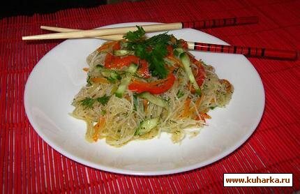В воке или в глубокой сковороде раскалить масло, в течении нескольких секунд обжарить в нем лук и морковь, интенсивно помешивая, после туда же добавить половину болгарского перца. Обжариваем очень быстро, чтобы овощи, как говориться, были с хрустинкой. Выложить овощи к лапше, перемешать с помощью двух вилок.