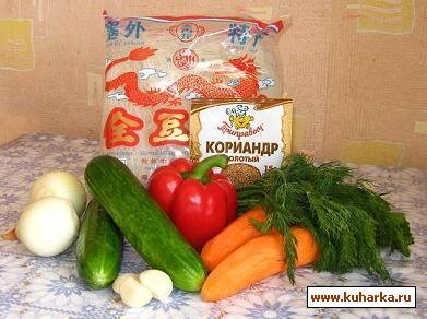 Замочить рисовую лапшу в прохладной подсоленной воде примерно на полчасика. Тем временем нашинковать лук, морковь и болгарский перец тонкой соломкой.