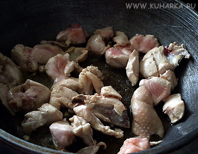 Довольно приятный суп! В чугунном казане или другой глубокой толстостенной посуде нагреть топленое (сливочное) масло и обжарить на нем небольшие куски курицы.