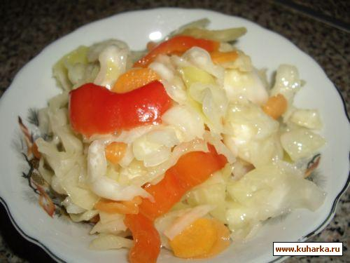 Капусту порубить "шашечками", морковь порезать кружочками, лук и перец полукольцами. Овощи сложить в большую емкость, смешать с остальными ингредиентами, осторожно перемешать, дать постоять 30 минут (КАПУСТУ РУКАМИ НЕ МЯТЬ, ОНА САМА ДАСТ СОК). Переложить в стеклянные банки, чуть надавить кулаком, чтобы сок покрыл капусту и поставить на холод. Капуста готова на следующий день.
