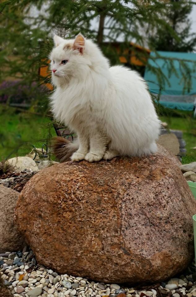 Не знаю, как у вас, а у меня, мои большие собаки постоянно кого-то находят – то щенков, то котят. Они находят, а мне приходится спасать. Ну а что поделать? 🐱 Однажды мой друг попросил меня подержать у себя на конюшне свою собаку, испанского мастиффа по кличке Бяка. Ну, вот такая у неё была кличка. На самом деле она была совсем не бяка, а очень даже хорошая и очень большая. 🐱 С Бякой мы гуляли много и с удовольствием. Она была послушная и очень милая. И вот, на одной из прогулок мы и нашли её. Я увидела, что Бяка упёрлась носом в кем-то брошенное автомобильное колесо. Я пыталась её оттащить, но попробуйте оттащить масиффа, который упёрся. Вот, и у меня не получилось. 🐱 Сначала я ничего не увидела. Но потом, заглянув глубже, я обнаружила крошечного, помещающегося на ладони белого котёнка с небесно-голубыми глазами. Он был таким слабеньким, что уже не плакал. Какая-то дрянь выкинула его в это колесо на верную смерть…, если бы не мы с Бякой. Ну как можно было его там оставить? Естест