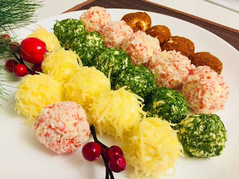 Очень вкусная, нежная сырная закуска к праздничному столу. Удивите своих гостей! Ингредиенты: 1. Плавленый сырок - 4 шт. 2. Куриные яйца - 2 шт. 3. Чеснок - 2 зубчика. 4. Майонез - 2 ст. ложки. Для начинки: 1. Оливки, маслины без косточки или виноград. Для панировки: 1. Тертый сыр. 2. Крабовые палочки. 3. Сладкая паприка. 4. Зеленый укроп. Способ приготовления: 1. Для начала нужно подготовить основу для всех сырных шариков. На мелкой терке натереть отваренные куриные яйца и плавленые сырки. Лучше всего плавленые сырки предварительно слегка подморозить в морозильнике. Соединить натертые куриные яйца и плавленые сырки, добавить пропущенные через пресс 2 зубчика чеснока. Добавить приблизительно 2 ст. ложки майонеза и тщательно перемешать. 2. Дня панировки. Свежий укроп мелко нарезать и отправить на плоскую тарелку. Твердый сыр натереть на мелкой терке и отправить на другую плоскую тарелку. Крабовые палочки так же натереть на мелкой терке. На следующую плоскую тарелку насыпать сл