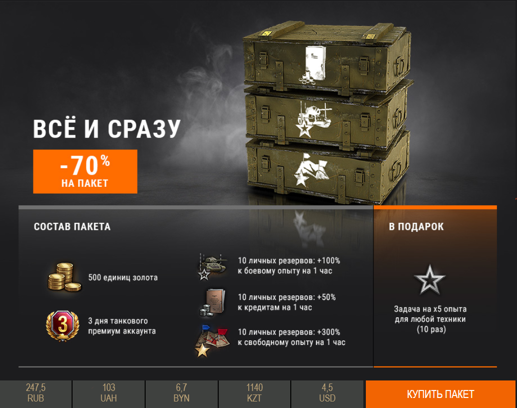 Господа, всем привет! Сегодня (22.11.2019) и до до 25 ноября 12:00 (МСК) в World of Tanks полноценно проходит "Черная пятница". Это значит, что хорошие скидки и редкие танки в наличии. В акции участвуют: танки, стили, наборы с премом. Скидки приятные и в некоторых случаях одни из самых больших и выгодных на весь год. А я хотел рассказать Вам, на что стоит обратить внимание. Хочу сразу сказать, что это не призыв к донату. А моё мнение, на что можно потратиться и не пожалеть. Хочется отметить, что скоро Новый год, а значит будут щедрые акции и кейсы, которые не менее выгодные, а при невероятном везении - супер выгодные. Первое, на что можно обратить внимание, тем, кто прокачивает определённую технику. Набор получился правда выгодный, тут и задачи на х5 и прем и резервы. Что за небольшую цену даст отличный рывок в прокачке. Для тех, кто не хочет платить за резервы, есть небольшой и тоже выгодный набор: С наборами закончим и перейдем к танкам. Я не буду смотреть на узкоспециализирова
