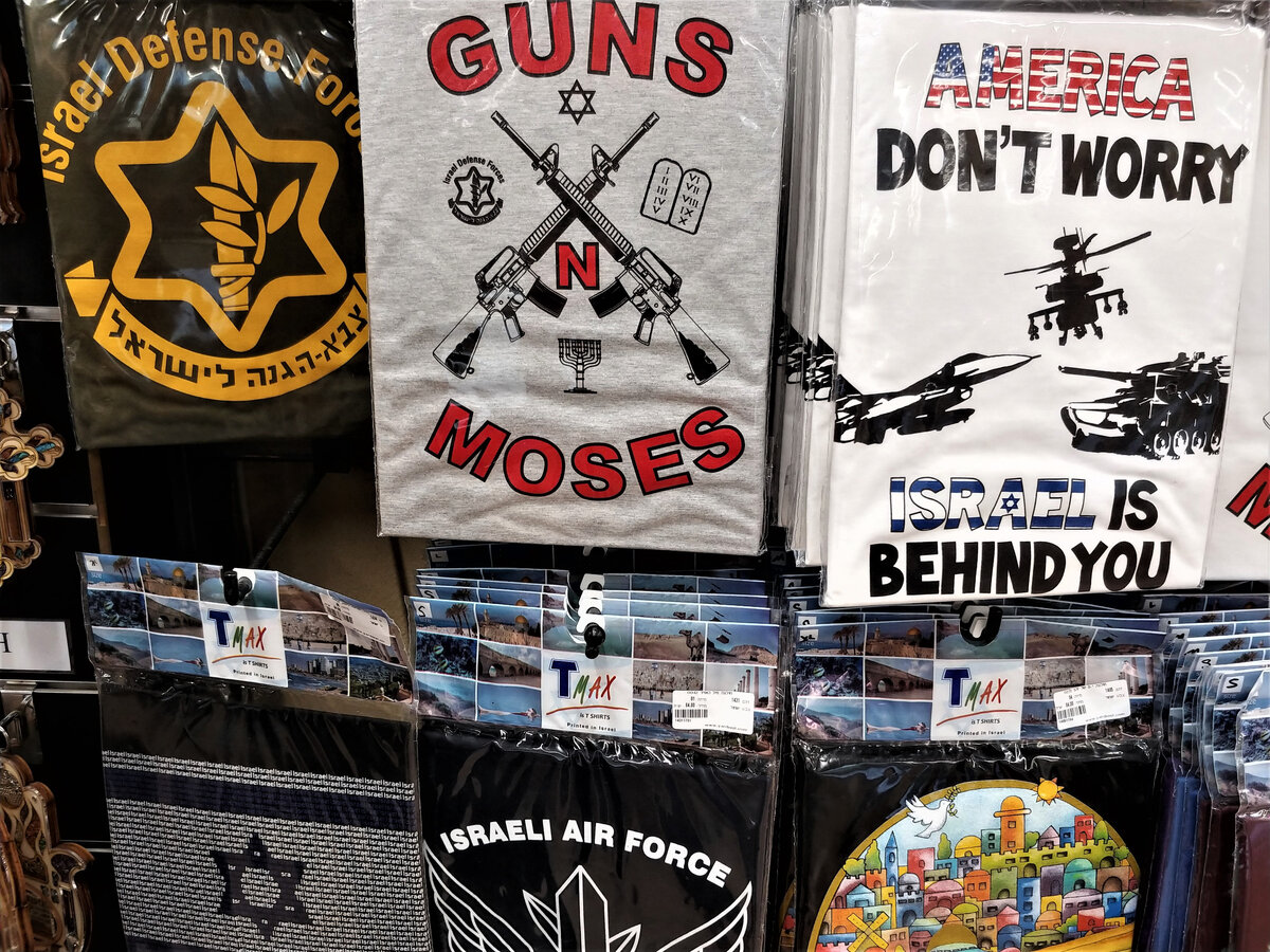 Вы можете себе представить, чтобы в одном и том же сувенирном магазине продавали футболки "Крым это Россия" и "Слава Правому сектору"? Звучит как бред. Или, еще лучше "Армия Украины всех сильнее" и там же рядом портрет Путина и надпись "Вежливые люди". Так вот, в Израиле именно так и происходит, с поправкой на местные реалии. В Иерусалиме в сувенирных лавках соседствуют палестинские сувениры и лозунги "Свобода Палестине" и "Бойкот Израилю" с футболками и банерами "Армия обороны Израиля" и "Америка не бойся, Израиль с тобой". Причем продают такие вещи в каждой лавке как продавцы евреи, так и арабы. Еще и побегут к соседу за нужной вещью, если турист симпатизирует арабам и хочет палестинский сувенир, а у еврея они закончились. Любые шалости за ваши деньги, дамы и господа! А вообще в Израиле классно, с приветом из Иерусалима -