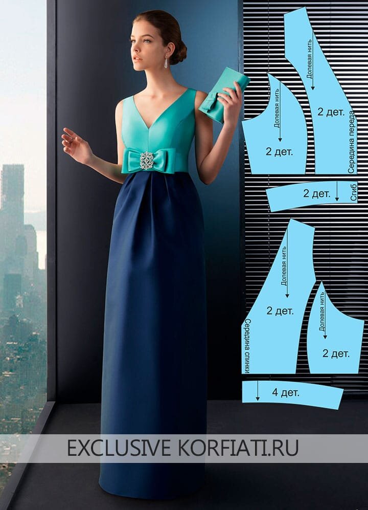 Стремительно приближаются новогодние праздники, а вместе с ними — феерия изысканных вечеринок в кругу друзей. Для того, чтобы быть готовой ко встрече самого волшебного праздника в году, каждой девушке обязательно надо сшить новое шикарное платье. Именно такое, как мы вам предлагаем сегодня. Длинное двухцветное платье из плотного атласа с большим бантом достойно даже самого изысканного королевского приема! Выкройка длинного платья с бантом моделируется по базовой выкройке платья прилегающего силуэта, которую вы можете построить по собственным меркам или скачать выкройку платья бесплатно. По спинке платье застегивается на потайную застежку-молнию. Перед тем как приступить к моделированию выкройки изделия, необходимо выполнить технический эскиз модели - рисунок выше. Длина платья от талии около 106 см. https://korfiati.ru/2016/11/vyikroyka-dlinnogo-platya/