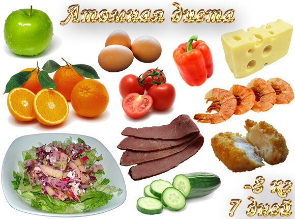 Современные диетологи уже не раз удивляли нас своими диетами, зная принципы правильного питания и действие на организм белковой, углеводной и жирной пищи они не раз создавали диеты, помогающие миллионам страдающим от лишнего веса. В одной из швейцарских клиник была создана диета под невероятным названием – атомная. Атомная диета не состоит из конкретного меню, она руководствуется правилами. Правил не так то и много, однако они предполагают серьезные ограничения в еде. С таким ограничением все равно можно сделать меню разнообразным. В белковый день можно кушать: — мясо — птица — рыба — морепродукты — творог — сыр — молоко — кефир — колбаса и сосиски — яйцо и др. белковые продукты. День на клетчатки (овощи и фрукты), также наполнен разными блюдами: — овощи — фрукты (кроме бананов и винограда). Если без бананов вы не представляете себе жизнь, то воспользуйтесь банановой диетой. — салаты — постные супы, борщи без картофеля Что пить: — вода — чай — кофе Атомная диета дает отличные результат