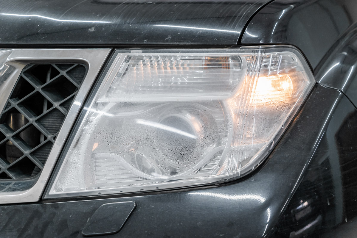 Автомобиль Nissan Pathfinder заехал в наш автосервис на «Мельникова, 5» с сильно запотевшей левой фарой, которая уже не светила, очевидно, из-за перегорания блока розжига ксенона. Собственно, от нас требовалось найти и устранить причину запотевания, поменять блок розжига, а также сразу заменить штатные лампы на новые. Мы будем устанавливать стандартные ксеноновые лампы Osram Original D1S, светящие бело-желтым светом. Сразу давайте поговорим о возможных причинах запотевания фар. Вообще все упирается в большинстве случаев в физическое воздействие, то есть разгерметизация может последовать после легкого столкновения или даже после неудачного прыжка на лежачем полицейском. Нередко фары запотевают из-за конструкционной ошибки, как на Мерседесах 222, но в данном случае после диагностики мы выяснили, что причина как раз в рассохшемся герметике. Для ремонта запотевшей фары Ниссан Патфайндер мы ее демонтируем и продуваем воздухом под давлением, опрыскав ее предварительно мыльной жидкостью