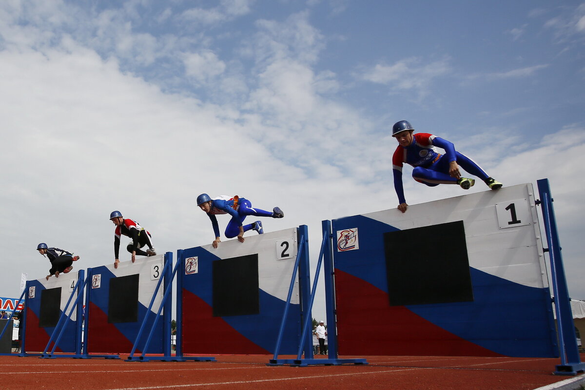 Преодоление 100-метровой полосы с препятствиями Соревнования по преодолению 100-метровой полосы с препятствиями проводятся в последовательности: а) спортсмен со стволом становится перед линией старта, не наступая на неё (ствол находится в любом положении); б) при беге по дистанции преодолевает забор, берёт рукава, преодолевает бревно (бум), соединяет рукава между собой, подбегает к разветвлению, присоединяет к нему рукавную линию и прокладывает её. Забор преодолевается без упора ногами о стойки и откосы крестовин. Рукава переносятся любым способом. Смыкание соединительных головок между собой, к разветвлению и стволу разрешается производить на месте и в движении по дистанции. При соскоке с бревна на землю до ограничительной линии спортсмен обязан вернуться и вновь преодолеть бревно. Запрещается переносить разветвление с места его установки; в) после финиша все соединительные головки должны быть сомкнутыми; г) спортсмен на финише должен удерживать рукавную линию таким образом, чтобы су