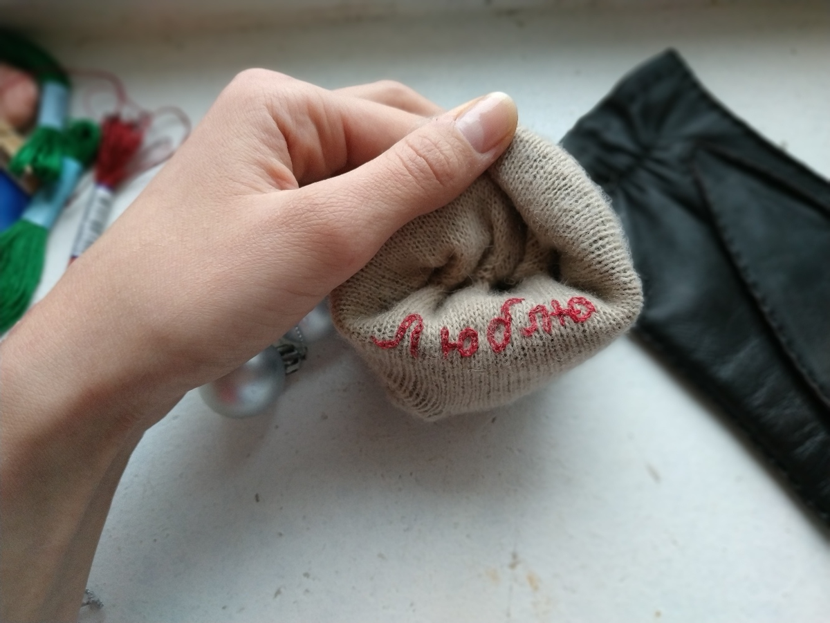 Хочу поделиться с вами идеей интересной задумки подарка на новый год с использованием ручной вышивки. Перед самым новым годом ко мне пришла заказчица с дизайнерскими перчатками и такой идеей "вышейте мне пожалуйста на подкладке одной перчатки слово люблю. Это для моего мужа, просто мы всегда ходим за руку, когда мы вместе ,а вот когда меня нет рядом он ощущал это вышитое слово на ладошке и вспоминал о том, как я его люблю". Выполнила я заказ на одном дыхание, и моя заказчица счастливая упархала к своему мужчине. Честно, я была так растроганна. Идея настолько милая и душевная, что я делюсь ею с Вами. Итак, можно взять перчатки, футболку, носки или рубашку в качестве подарка, а на изнаночной стороне, там, где будет видно только ему вышить несколько теплых слов. Напишите ему(ей) , что вы его(ее) любите, что вы дорожите им(ей) , что он(она) часть вашей жизни. А теперь расскажу как проще и логичнее это сделать. 1. Пишите на изделие с помощью маркера по ткани фразу. 2. Берете нитки мулин
