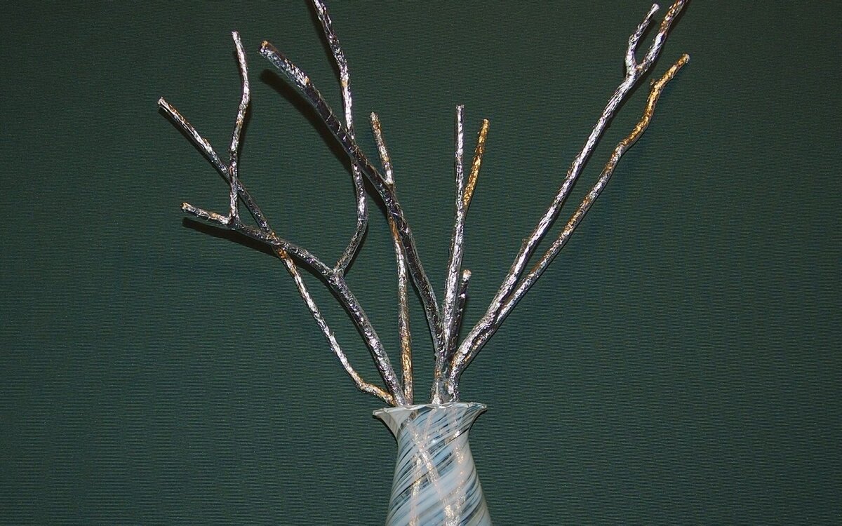 Мне понадобились ветки в вазе. Чтоб повесить на них маленькие украшеньица, о которых расскажу в другой раз. В интернете нашла данный способ – оборачивание веток фольгой. Решила проверить, насколько он хорош. Результат полностью устроил. Поэтому рекомендую. Подготовительный этап Взяла две ветки от куста смородины, который в этом году выкорчевали. До сих пор пахнут 🙂 Ножом срезала всякие мелкие выступы. Кусочки коры, пупырышки и прочее. Чтоб фольга не рвалась, а аккуратно ложилась. Потом обернула маленькими лоскутками сложные участки. Развилки в основном. И один сучок. Уголки и кончики приклеивала Титаном. Всё мазать не надо, главное, чтоб ничего не топорщилось. И не снималось. Как оборачивала ветки фольгой Нарвала по линейке полоски. Примерно 2-3 см. Смазывала клеем начало полосы. Накручивала её и смазывала конец. Фольга отлично приклеивается. Отлично укладывается. Отлично смотрится. Сколько времени и фольги надо Вот эти две ветки я оборачивала два часа. Вместе с подготовкой фольги.