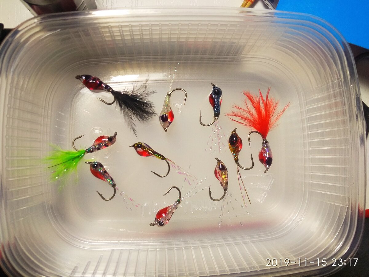 С началом ледостава поступает много заказов на так называемые "пыздрики". Как лёгкие,и которые привязываются в тандеме с тяжёлой приманкой. Так и огруженные, применяемые самостоятельно... Лёгкий пыздрик мы уже делали. Сегодня рассмотрим тяжёлый. Для его изготовления нам, дополнительно понадобится груз. В данном случае это будет обычное грузило дробинка. Вес можно варьировать по своему усмотрению. Возьмём крючок с длинным цевьём и закрепим его в тисках. Нагреем у колечка зажигалкой и согнем его вот так. Оденем на место сгиба грузило. Благодаря сгибу грузило не будет вращаться. Я советую сразу покрасить. В данном случае применил черный лак для ногтей. Глазки нарисованы флюоресцентным ярко оранжевым лаком. Намотаем монтажную нить к загибу крючка. Теперь берём немного черного пера марабу и крепим на цевье крючка. Перо марабу очень мягкое и будет отлично играть в толще воды. Волокно флеш приматываем тут же у загиба. Теперь нам нужен яркий элемент. Им будут волокна от ярко оран