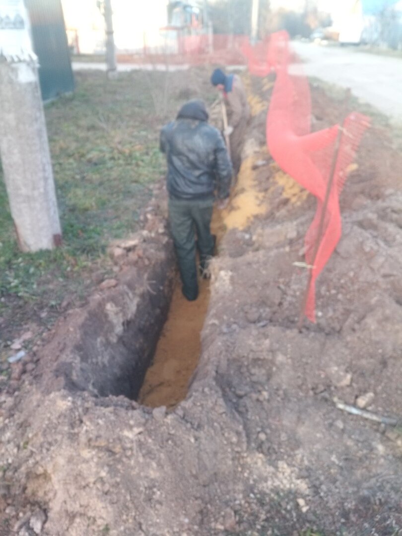День второй и третий на второй день выкопали еще 70 метров траншеи экскаватором была повреждена канализационная труба работы были приостановлены. День третий померили размер разрыва канализационной трубы съездили в магазин все купили кусок трубы 1 метр и две муфты Приступили к ремонту трубы окопали ее с двух сторон,отрезали с двух сторон чтобы были ровные края надели муфты вставили кусок трубы и соединили муфтами, далее пока было светло сделали по траншеи песочную подушку, сделали временное ограждение вдоль траншеи. Так как нам вовремя не завезли прокладочные трубы в траншею все работы приостановлены до понедельника.