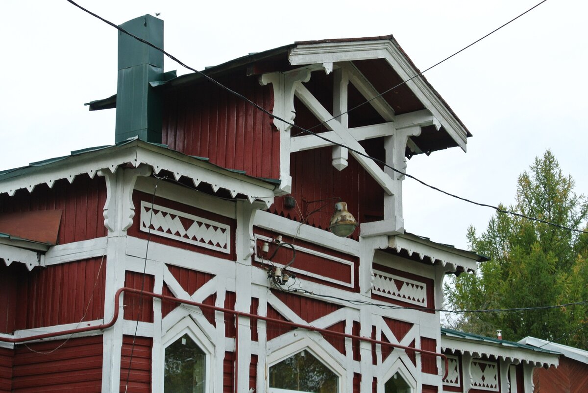 Этот стиль хорошо знаком завсегдатаям небольших железнодорожных станций Тверской, Ленинградской, Псковской, Новгородской и прочих областей северо-запада Центральной России. Ближе всего к правде будет определить его как "Деревянный промышленный модерн". В таком стиле часто исполнялись небольшие вокзалы в малых городах и посёлках. Другое дело, что таких вокзалов остается всё меньше с каждым годом. Многие горят (привет Калязину и Весьегонску), где-то орудуют рукожопые реставраторы (привет Савёлову). Этой же конторке повезло много больше. Недавно её неплохо отреставрировали снаружи. Что характерно, реставрацией занимались явно не РЖДшники, потому как здание не просто замазали серой краской, проведя по периметру красную черту. Очень классная, антуражная цветовая гамма. Вообще здание дошло до наших дней в удивительно хорошем состоянии. Единственное что, в веках потерялся шпиль над центральным козырьком. Вот он, на почтовой карточке 1915-го года.