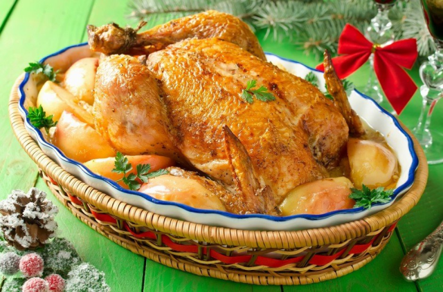 Сегодня мы попробуем приготовить блюдо, которое вполне подойдет для праздничного стола. Это курица с яблоками в сливочном соусе. Должно получиться вкусно. Для приготовления нам понадобятся ингредиенты: 1) тушка курицы - 2 кг; 2) лимон - 1 шт.; 3) тимьян - 1 чайная ложка; 4) соль - по вкусу; 5) перец - по вкусу; 6) масло сливочное - 60 г; 7) яблоки красные и зеленые - 500 г; 8) сливки 20% - 350 мл; 9) мука - 20 г; 10) лук репчатый - 180 г; 11) лавровый лист - 1 шт.; 12) чеснок - 2 зубчика; 13) сахар - 70 г; 14) вода 50 мл . Когда все ингредиенты подготовлены, начинаем готовку: 1. Сначала приготовим маринад для курицы. Для этого лимонную цедру втираем в размягченное сливочное масло (берем половину нашей порции - 30 г). Добавляем листики тимьяна, соль и черный молотый перец. Все это перемешиваем. 2. Когда смесь готова, натираем ей курицу внутри и снаружи и оставляем мариноваться на полчаса. 3. Берем яблоки и нарезаем крупными дольками. Наполняем брюхо курицы зелеными яблоками. Закалыва