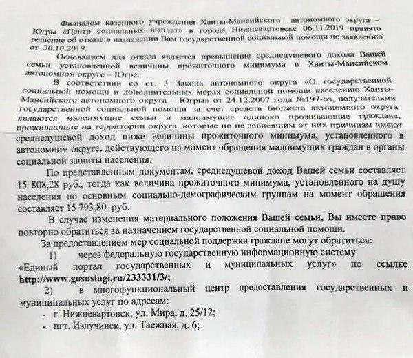 Среднемесячный доход превысил прожиточный минимум на 14 рублей 48 копеек. В Нижневартовске многодетной семье отказали в выплате пособия из-за 14 рублей "лишнего" дохода. В социальной сети ВКонтакте женщина рассказала, что многодетной семье с 3 детьми было отказано в выплате пособия. В прилагающемся документе разъяснено, что прожиточный минимум в крае составляет 15 тысяч 793 рубля 80 копеек. Среднедушевой месячный доход составляет 15 тысяч 808 рублей 28 копеек. Это на 14 рублей 48 копеек больше. В центре социальных выплат города Нижневартовска сообщили, что решение вынесено без нарушений.