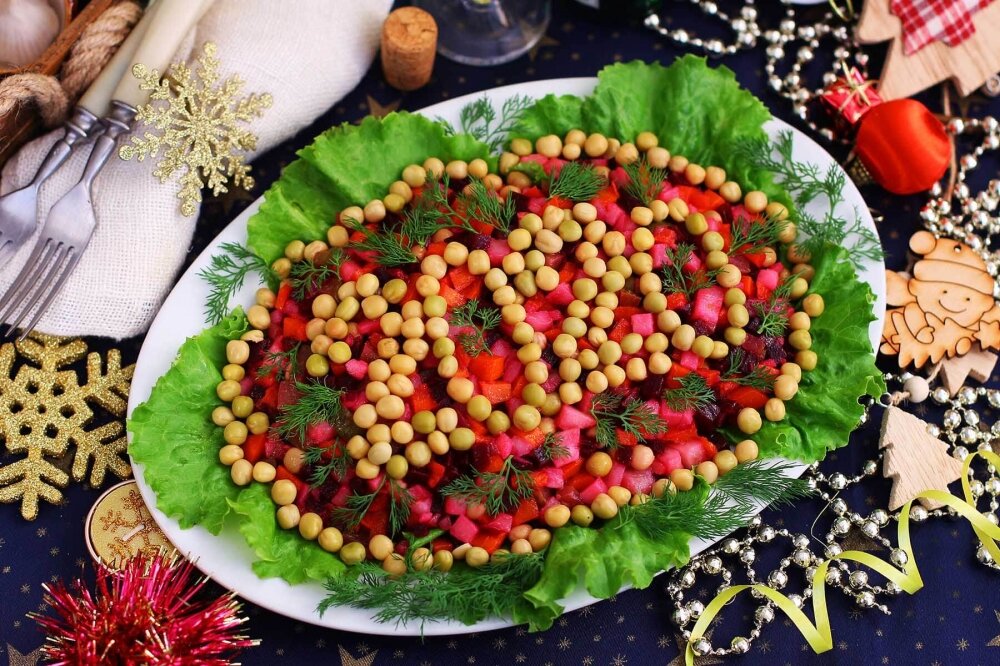 7. Оставленным ранее зеленым горошком украсьте винегрет по очертаниям салата и выложите цифры приходящего Нового года. Дополнительно украсьте винегрет свежими веточками зелени. Новогодний винегрет готов! Приятного аппетита!