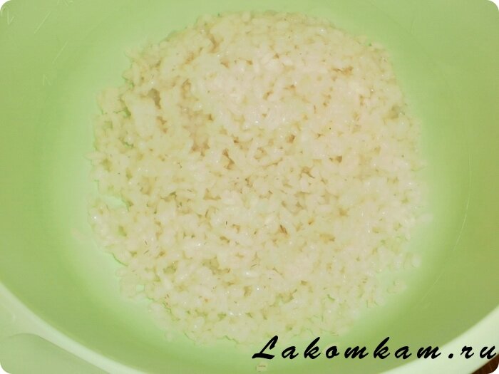 Начинаем растирать рис толкушкой, смоченной в подсоленной воде до пастообразного состояния.