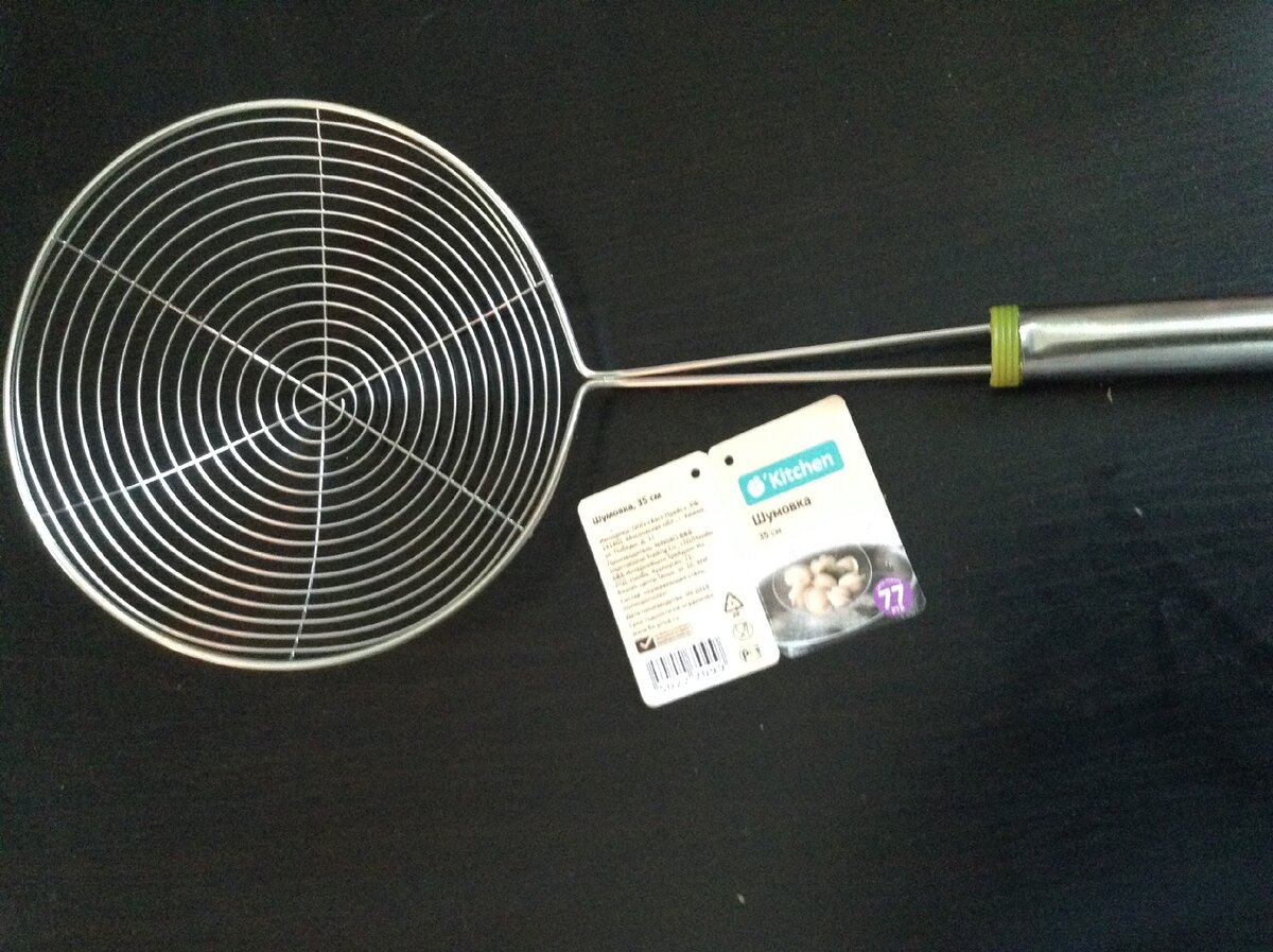Шумовка 35 см, цена 77-00 рублей. Изготовлено из нержавеющей стали, полипропилен. Пригодится для извлечения готовых продуктов из горячего фритюра или кипящей воды. Редкая сетка задерживает меньше масла или воды. Проволока при температуре не деформируется и не выделяет вредных веществ. Длина ручки не дает обжечься раскаленным маслом или кипящей водой. Давно хотела приобрести. Вещь нужная и удобная.