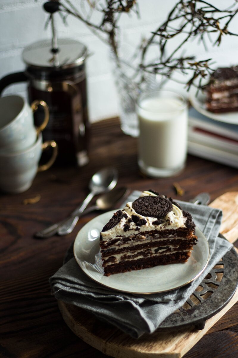 Торт "Орео" 😍 Какой же вкусный! И вид у него нарядный🎂 Можно такой и на семейный праздник приготовить. Рецепт очень простой и необычный. Первый раз пекла коржи на кипятке. И теперь для тортов буду использовать основу только по такому рецепту. Ингредиенты: 110 г муки; яйцо; 120 г сахара; 30 г какао; 85 мл молока; 45 мл рафинированного масла; 85 мл кипятка; 1 ч. л. (по края) соды; 1 ч. л. (по края)