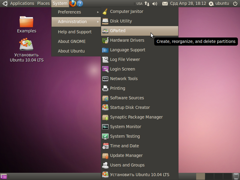 Зайдите в меню System→Administration и запустите программу Gparted: