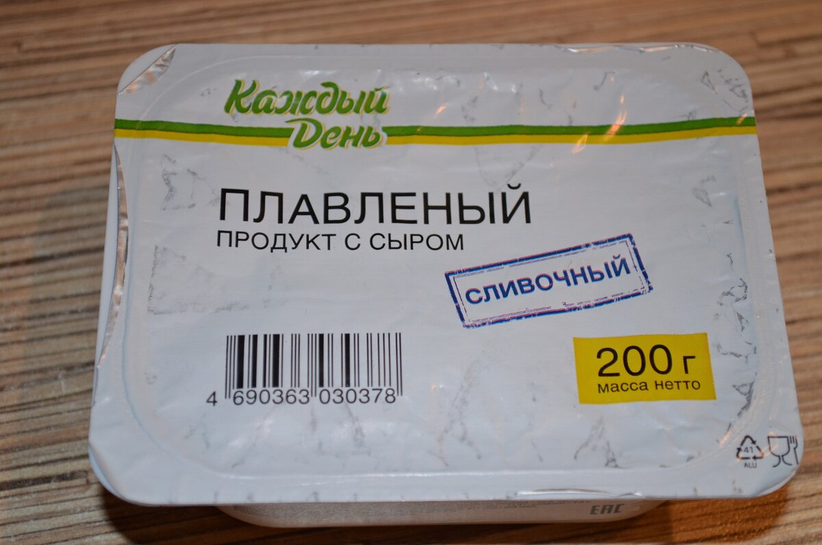 Тестирую собственную продукцию магазина «Ашан». Порой под товарами марки «Каждый день» скрывается кошмарное нечто, а иногда качество приятно радует. Сегодня решил купить плавленый сыр и, так сказать, испытать его в бою. Первое, что хочется отметить – цена. 29 рублей, Карл! Первое впечатление – это должно быть ужасно. Хоть производитель и не скрывает, что это не сыр, а сырный продукт, 200 граммов за 29 рублей – это слишком дешево. На витрине был плавленый сыр с ветчиной, с грибами, шоколадный и сливочный. Остановился на последнем, классическом. В составе, как и ожидалось, пальмовое масло и заменитель молочного жира. Но при этом написано, что приготовления используется полутвердый сыр, и нежирный сыр для плавления. В общем, не вау, но все в рамках нормы. На вид ашановский чудо-продукт достаточно густой. На вкус – мммм! Очень даже сливочный, очень даже сыр. Я был приятно удивлен. Можно было ограничиться бутербродами, но я решил шикануть. На радостях приготовил сразу 2 блюда: мясо по-фр