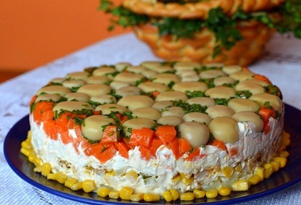 1. Морковь с картофелем в кожуре и яйца отвариваем, охлаждаем и очищаем. Банки с кукурузой и грибами открываем и сливаем жидкость. Грибы используем целые и большую банку.