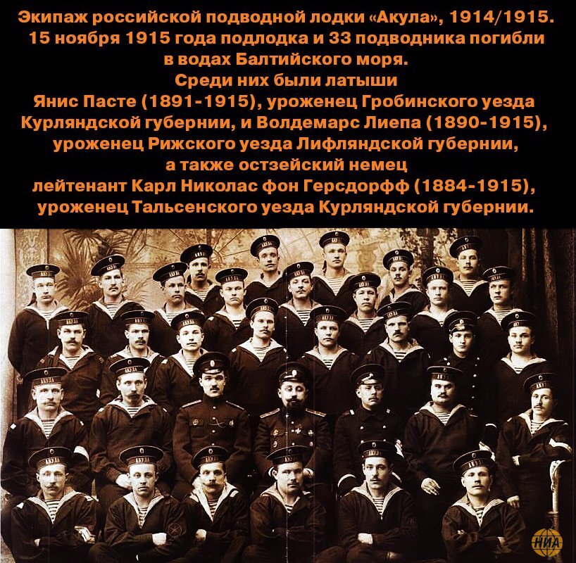 Латышские подводники «под флагами нашего могучего Отечества Российского» Как я недавно писал, за единую и неделимую Российскую империю латыши воевали не только в латышских стрелковых батальонах и полках, но и в других частях Русской императорской армии: в пехотных полках, в сибирских стрелковых полках, на кораблях Флота Балтийского моря. В связи с недавней историей про варварски снесённый в Риге латвийскими властями памятник подводникам – героям Балтики, конечно же, интересно вспомнить именно моряков из экипажей подводных лодок. Так, 21 ноября 1915 года газета Dzimtenes Vēstnesis («Вестник Родины») опубликовала такое приветственное письмо, адресованное бойцам латышских стрелковых частей царской армии: «Привет латышским стрелковым батальонам от латышских моряков подлодок Балтийского флота! Skat, Baltijas juras krastos, Kur baltas putas šķīst, Tur pretim viļņu rakstos Jums musu sveiciens klīst Смотрите, на Балтийского моря берегах, Где белая пена растворяется, Там против волн