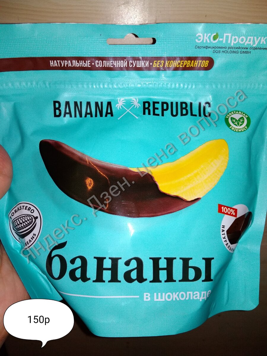 Здравствуйте, дорогие друзья! Пробую очередную новинку из "Пятерочки". В пятницу после работы муж зашёл в "Пятерочку" и принес домой вот такую красивую пачку. Бананы в шоколаде Цена за пачку 150 рублей. Вес всего-то 200 грамм. А это 750 рублей за 1 кг. Для сведения, сейчас бананы продают по 65 рублей/1 кг. Значит мы переплатили в 10 раз. Как сейчас "модно", внутри меня ждёт ЭКО-продукт. И 100% натуральный шоколад . 🍫 В описании указано, что бананы собраны вручную в Тайланде и высушены на солнце. ☀️ Внутри пачки я нашла вот такие шоколадные колбаски. Ровно 12 штук. Получается что 1 банан в шоколаде стоит примерно 12₽. Бабаны разного размера, есть совсем короткие, а есть длиннее в 2 раза. Я откусила одну колбасу и внутри увидела сушёный банан. Вкус: да, это вкусно. Действительно вкусные сушеные бананы + нормальный "не дешёвый" шоколад. Если вы любители вяленых сушеных бананов, то вам точно понравится. Бананы внутри мягкие, слой шоколада, который снаружи, ломается на зубах. Этако