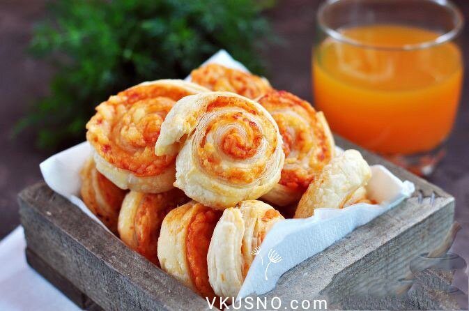 Ингредиенты: Тесто слоеное - 300 г Сыр твердый - 100 г Кетчуп 2 ст. л. Перец черный молотый по вкусу. Мука - для раскатывания те Мука - для раскатывания теста. Приготовления: 1. Тесто предварительно разморозьте. Присыпьте бумагу для выпечки мукой, разложите тесто, раскатайте скалкой в пласт толщиной 0,3-0,4 см. 2. Смажьте тесто тонким слоем кетчупа 3. Сыр натрите на крупной терке. 4. Посыпьте тесто сыром поверх кетчупа. Скрутите слоеное тесто с начинкой рулетом, шов слегка защипните 5. Выложите рулет с сыром на твердую поверхность швом вниз. Острым ножом нарежьте рулет на маленькие рулетики-завитки шириной 1 см. 6. Выложите бумагу для выпечки на противень. На бумагу выложите заготовки из слоеного теста срезом вверх, слегка приплюсните их ладонью. 7. Выпекайте слойки с сыром предварительно разогретой духовке при 180-190 градусах 20-25 минут. Готовые слоеные завитки с сыром остудите и подавайте. ПРИЯТНОГО АППЕТИТА. Лучшая в мире еда с рецептами : https://zen.yandex.ru/id/5dcee21708997