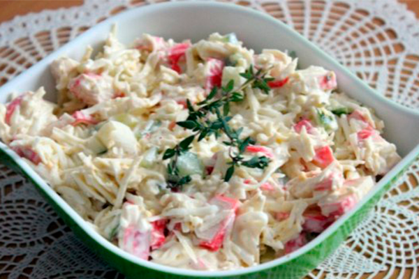 Это будет хит новогоднего застолья, я вам гарантирую! Салаты с крабовыми палочками очень популярны на праздничном столе, поэтому берите рецепт на заметку, тем более скоро Новый год! Приготовление: Этот салатик готовится быстро и просто, вы потратите на него не более 15 минут. Кроме того, салат получается очень вкусный, нежный - все гости будут в восторге! Итак, нам понадобится 1 упаковка крабовых палочек. Режем их небольшими кусочками. Добавляем к ним 1 свежий огурец среднего размера. Далее кладем в салат 3-4 вареных яйца, их натираем на терке либо мелко режем. Затем один плавленый сырок натираем на терке и добавляем к остальным ингредиентам. Кстати, чтобы сырок было проще натереть, положите его ненадолго в морозилку - я так всегда делаю. Натирается потом как по маслу. Ну и остались завершающие штрихи: солим по вкусу, можно добавить зубчик чеснока - он придаст салату пикантную нотку. По желанию кладем зелень (укроп идеально подходит). В качестве заправки используем майонез, перемешива