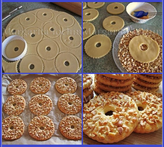ПРИГОТОВЛЕНИЕ: - 250 г сливочного масла (холодного) - порезать кусочками - 150 г сахара - 1 яйцo (среднее) - 1 п. ванильного сахара (8 г) - 1 ч. л. с горкой разрыхлителя (5 г) - 2,5 ст. муки (400 г) - просеять ДОПОЛНИТЕЛЬНО: 1 ст. жареного арахиса (160 г) - порубить не мелко ножом ДЛЯ СМАЗЫВАНИЯ: 1 желток + 2 ст. л. молока - перемешать вилочкой ПРИГОТОВЛЕНИЕ: В чашку выкладываем масло, сахар, яйцо, ванил. сахар и разрыхлитель - слегка перемешиваем. Постепенно подсыпая муку, замешиваем песочное тесто (оно будет мягкое и не будет липнуть к столу и рукам). Чашку с тестом накрываем крышкой и ставим в холодильник на 30 минут. Затем тесто совсем слегка вымешиваем и раскатываем в пласт толщиной 8 мм, припыляя стол мукой. Вырезаем формочкой большие кругляшки (у меня размером 9,5 см). Затем в центре больших кругляшек подручными средствами вырезаем маленький кружок (я воспользовалась прибором для удаления сердцевины в яблоках, у меня диаметром 2 см). Об