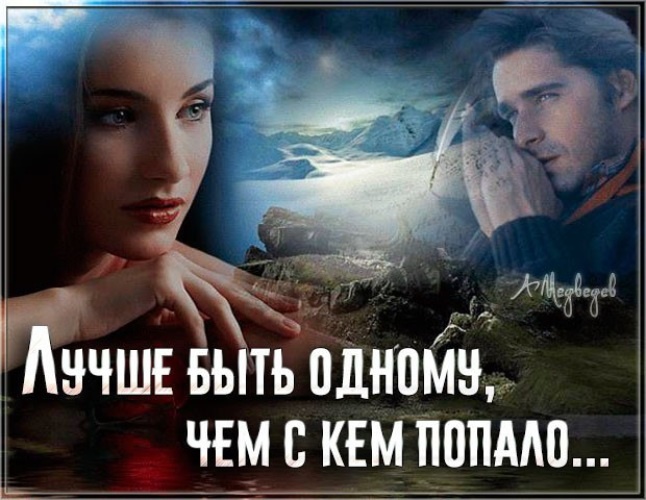 Если вы встречаете человека, от которого у вас загораются глаза, кто заставляет вас с удовольствием просыпаться по утрам, кто мотивирует вас на самосовершенствование и подвиги, ради которого хочется идти вверх, тогда заводите отношения с ним. Будьте с ним и проведите с ним вечность! Но, если такого человека у вас нет, тогда оставайтесь одни так долго, сколько вам нужно! Потому что в этом нет ничего плохого, не нужно быть как все и стремиться к тому, что вам не нужно. Не стесняйтесь говорить родственникам, что вы одиноки, когда вы собираетесь по праздникам, и они спрашивают о вашей личной жизни. Не смущайтесь, когда только вы одна среди всех подруг еще не замужем и без детей. Не обманывайтесь, заставляя себя поверить, что вам будет лучше в отношениях хоть с кем-то. "Лучше быть одному, чем с кем попало" Лучше оставаться одной, чем с тем, кто: Вместо того, чтобы быть с токсичным для вас человеком, или наоборот с самым хорошим человеком, из-за которого вы чувствуете "самоненависть", по