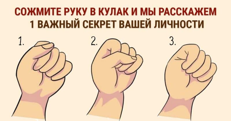 Характер человек легче всего узнать, когда он делает что-то непроизвольно. Поэтому при прохождении теста не нужно задумываться, как нужно выполнять задание. Важно просто сжать ладонь в кулак и по картинкам посмотреть, какие особенности характера присущи в данном случае. Вариант 1. Вы открытый, доброжелательный и участливый человек. Люди чувствуют это, поэтому вокруг вас всегда много друзей, знакомых и близких. К тому же вы отлично просчитываете ситуацию на несколько шагов вперед, что позволяет избегать неприятностей даже тогда, когда они закономерны. Но есть и обратная сторона медали. Люди, стремящиеся воспользоваться чужой добротой, зачастую пытаются использовать вас в своих целях. Поэтому таких личностей нужно гнать от себя без стеснений и сожалений. Вариант 2. Вы целеустремлены, амбициозны, всегда стремитесь завоевать первенство, казалось бы, в самых сложных ситуациях. И что немаловажно, это удается сделать. Люди чувствуют энергию и харизму, поэтому вокруг вас всегда много друзей,