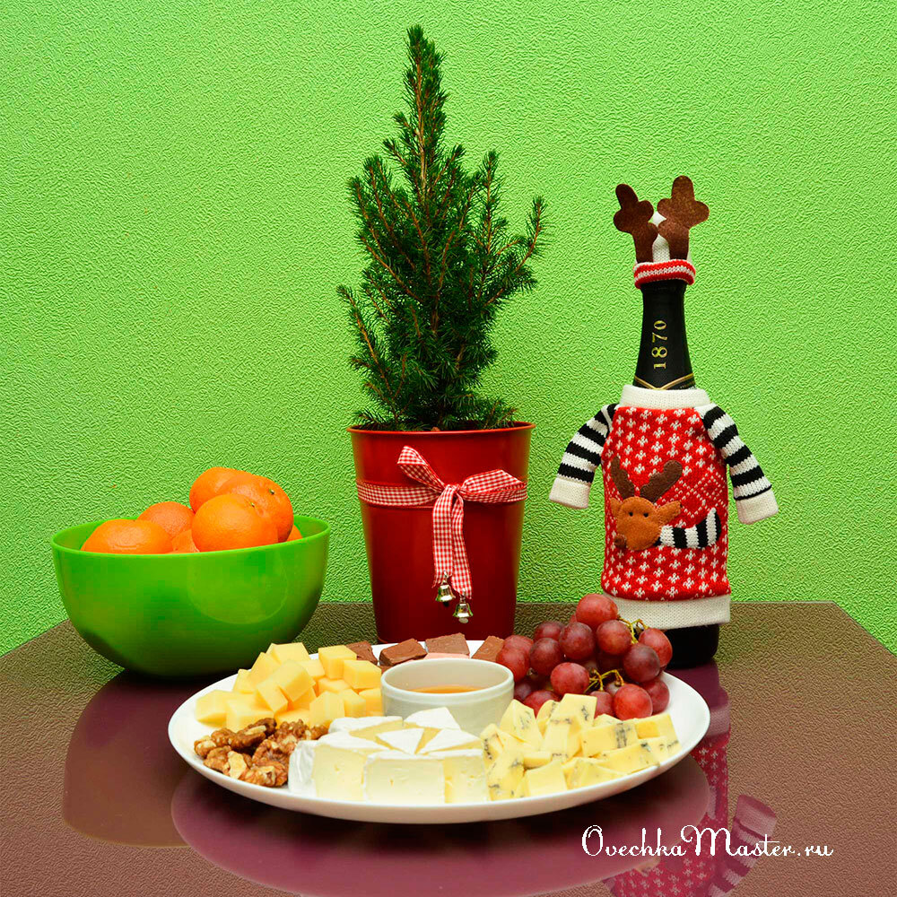 Всем добрый день. В позапрошлом году я к сырной тарелке делала вот такой декор. Ну хотя как делала? Это все покупное: и олень, и елочка с таким бантиком. А вот чехол в виде крысы будет вообще в тему к сырной тарелке!
