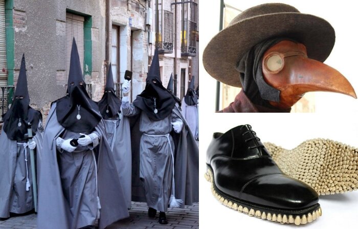 Многие сегодня тяготятся дресс-кодом, мечтая надеть джинсы с футболкой. А правила на работе не позволяют. Но если окунуться в прошлое, можно понять, что костюм с рубашкой и галстуком – это просто цветочки. Маска позора Выглядит как один из предметов, которые продаются в секс-шопах для любителей нетривиального секса. Предназначалась для женщин, которых обвиняли в колдовстве. На бедную женщину надевали маску, защемляли язык специальной пластиной, чтобы она не могла говорить, и водили на цепи по улицам. Костюм, которые одевали доктора в эпидемию чумы Выглядит как нечто несуразное. Именно этот балахон с головным убором, напоминающим голову вороны с длинным клювом, выделял докторов в эпоху Средневековья, когда в Европе свирепствовала чума. Кстати, клюв не только должен был отпугивать болезнь, но и служил средством превентивной меры, так как был напичкан лекарственными средствами с резким ароматом. Дополнением служил жезл с ладаном. Маска, которую надевали палачи Почему-то принято счи