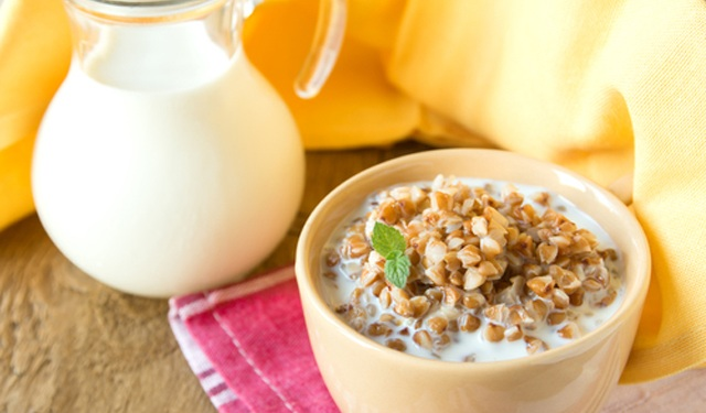 - Нужно взять пару столовых ложек сухой гречки и 200 грамм нежирного кефира (можно заменить простоквашей).