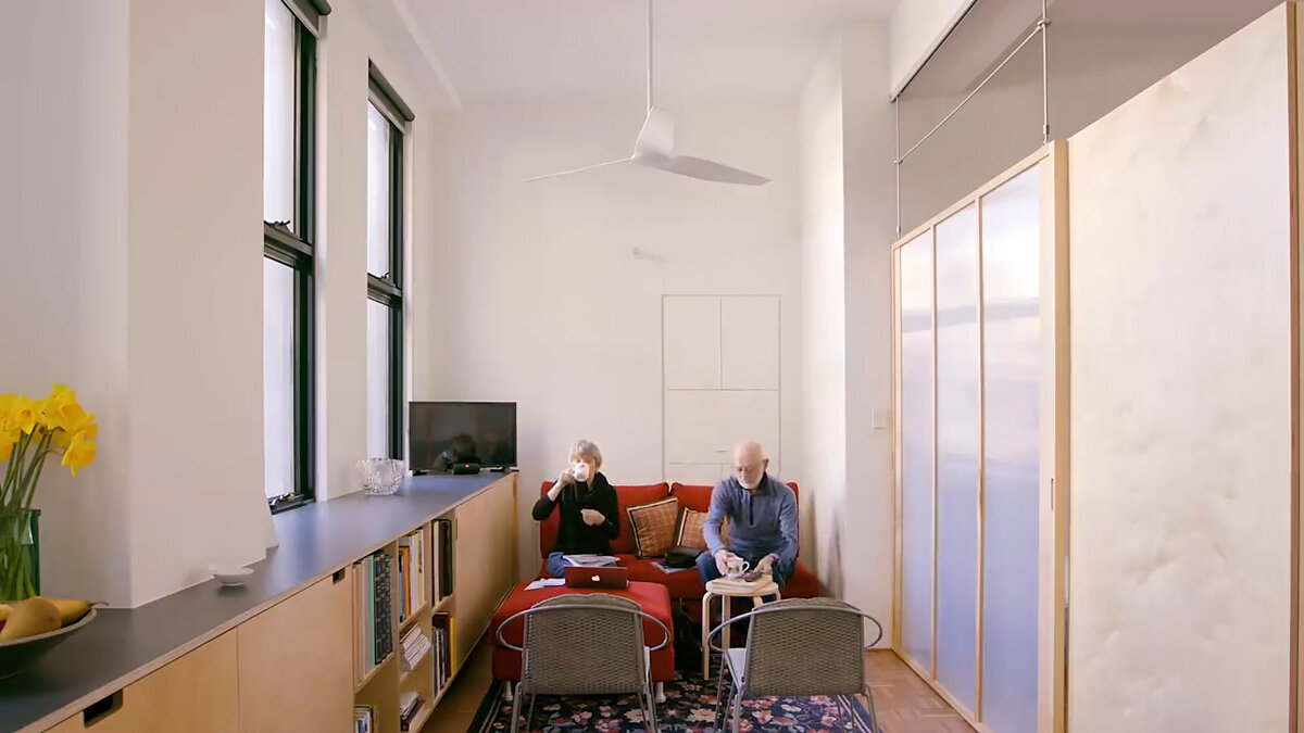Эта квартира принадлежит пожилой паре, которая переехала из загородного дома. Они переехали с участка в 100 гектар на тридцать восемь квадратных метров. Этот дом находится в Дарлингхерсте в Сиднее и представляет собой здание 1920-х годов постройки, а в конце 1990-х оно служило распределительным складом, впоследствии в здании провели перепланировку для заселения. Изначально квартира была в очень хорошем состоянии, просто в ней не хватало требуемой функциональности, необходимой для моих клиентов. Это в первую очередь зонирование пространства для возможности уединения и обеспечения личного пространства для каждого. Учитывая возраст моих клиентов, было важно, чтобы все помещения подходили для использования инвалидной коляски. Владельцы квартиры - пожилая пара - много путешествовали и работали за границей. Коралл была шеф-поваром и до сих пор остается очень увлеченным поваром поэтому важно было сделать кухню практичной и удобной. Благодаря тому что вся мебель находится в «подвешенном» с